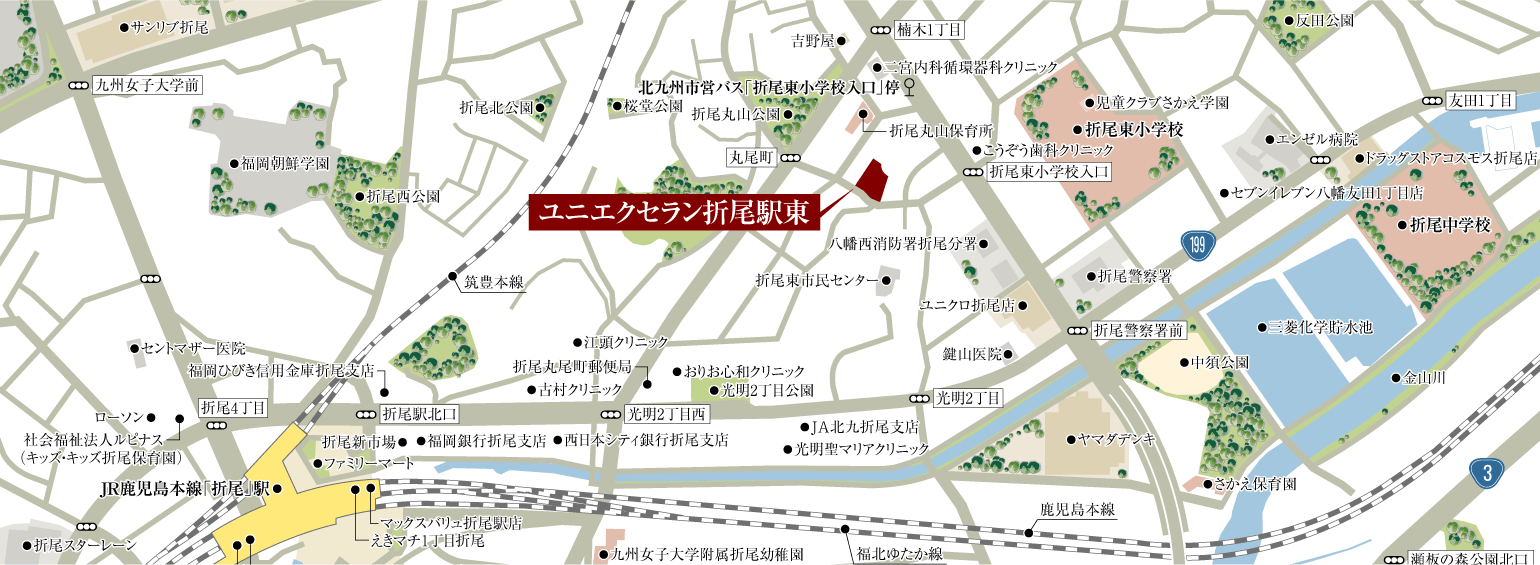 JR折尾駅まで徒歩11分、折尾東小学校へ徒歩4分。通勤や通学に便利なだけでなく、