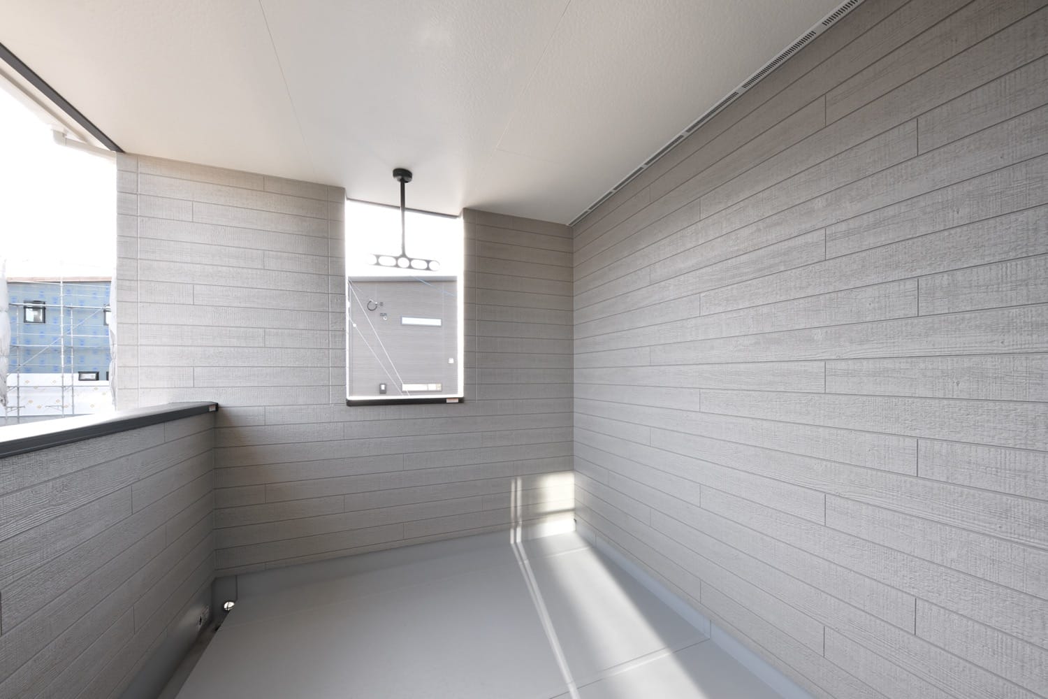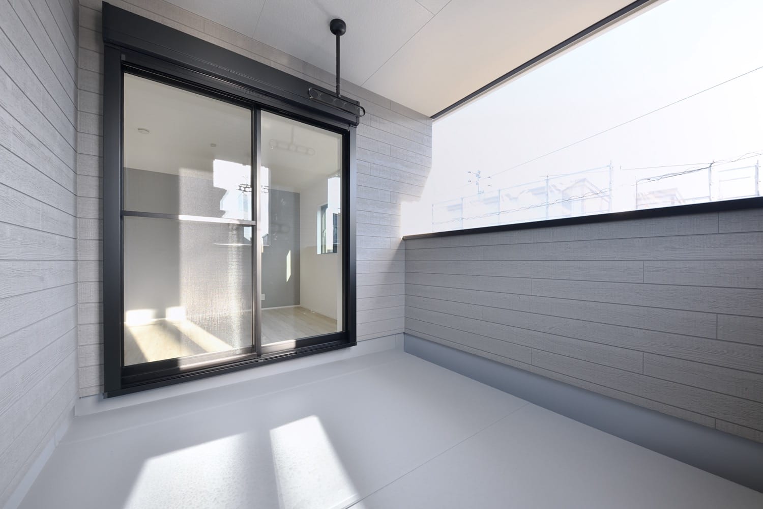 屋根付のバルコニーは天候に左右されずに洗濯物を干せます。またガーデニングスペースや日差しを遮ることで快適なリラックススペースとしても楽しめます。