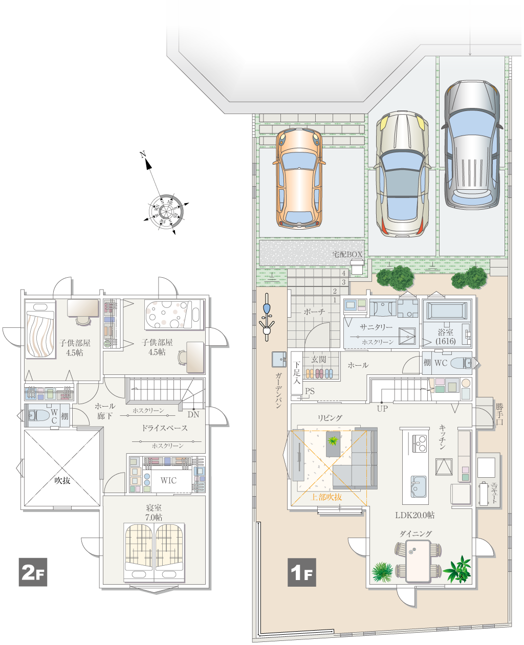 20帖のゆとりあるLDKに吹抜を組み合わせ、開放感と明るさにあふれる大空間を実現。リビングからダイニング、キッチンまで視線が抜け、家族の気配を感じながら過ごせる構成が魅力。毎日の暮らしがのびやかに広がる住まいです