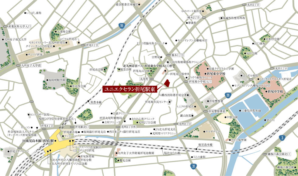 JR折尾駅まで徒歩11分、折尾東小学校へ徒歩4分。通勤や通学に便利なだけでなく、