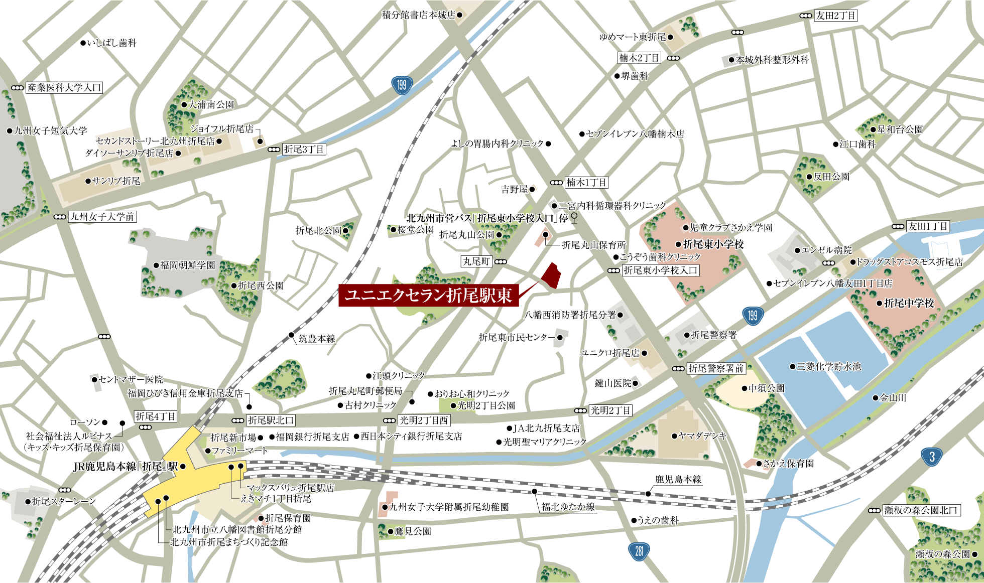 さらに、専門クリニックや産業医科大学病院も近く、万一の時も安心です。