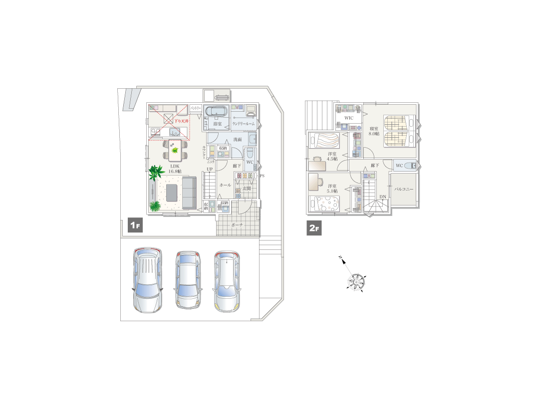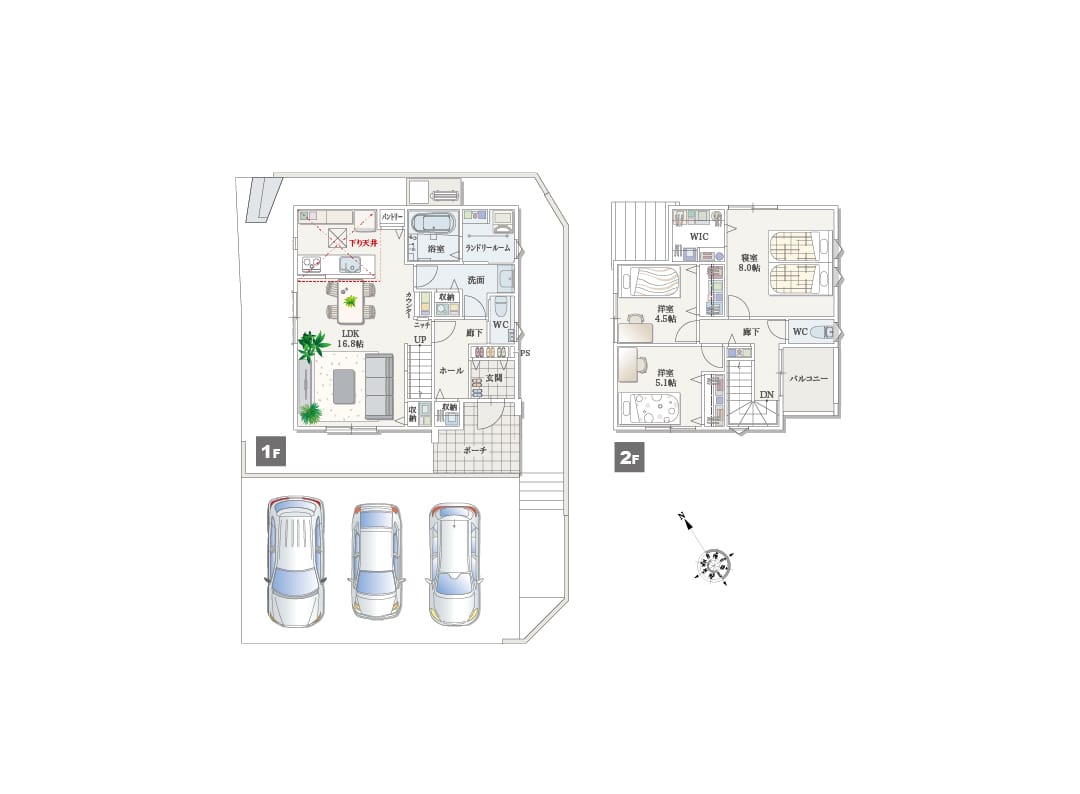 玄関から洗面、キッチン、リビングへと巡る動線は、帰宅後すぐに手洗いができたり、料理や片付けもスムーズ。家事も子育てもラクになる、家族思いの間取りです。