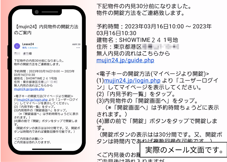 ご登録いただいたメールアドレスに、当日鍵を開けることのできるURLが届きます。もし届かない場合は当社までご連絡ください。